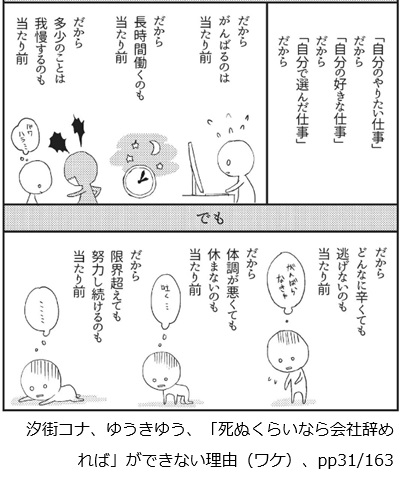 「死ぬくらいなら会社辞めればができない理由(ワケ)」は、精神科医ゆうきゆう、イラストレーター汐街コナによる一冊完結型の漫画作品です。