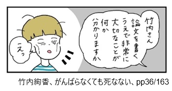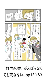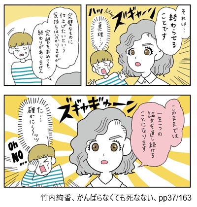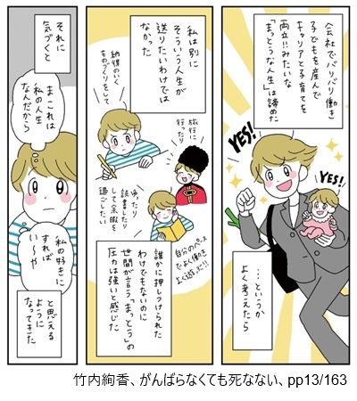 AccountThinking.net > D.文献等紹介 > 広告 D.文献等紹介がんばらなくても死なない 2025年12月17日 この項目は広告を兼ねています。文献紹介(1) コミックエッセイがんばらなくても死なないは、漫画家竹内絢香による一冊完結型の漫画作品です。にゃむーん「キャリアブレイク」とも呼ばれる、新たな生き方の実体験録です。図書館で探す!Amazonで読む!楽天で買う! 引用部分を詳しく読もう!終わらせること詳しく読む!引用部分(終わらせること)を詳しく知りたいAccount Thinking🄬の基本方針は、本文献に登場する担当教授のアドバイスに影響を受けています。「竹内さん 論文を書くうえで非常に大切なことが何か分かりますか」「えっ」 ※画像をクリックすると引用コマの配置を確認できます。引用にあたっては細心の注意を払っておりますが、原作のご一読にご協力ください。詳しくはサイトポリシーをご確認ください。「それは・・・ 終わらせることです」(ズギャーン)(ハッ)「真理・・・!」「完璧なものに仕上げたいという気持ちは分かりますが 完璧を求めても終わりがありません」「このままでは 一生一つの論文を直し続けることになります」(ズギャギャーン)「た・・・確かに~ッッ」(Oh NO・・・) ※画像をクリックすると引用コマの配置を確認できます。引用にあたっては細心の注意を払っておりますが、原作のご一読にご協力ください。詳しくはサイトポリシーをご確認ください。 引用先の記事! わたしが勉強中の事柄について記事を書く理由このエピソードを引用している記事はこちら! ビリーフ詳しく読む!引用部分(ビリーフ)を詳しく知りたい「ビリーフ」とは、思考の基盤となる信仰的解釈のこと。たとえば下のように「まっとうな人生を送らなければならない」という”世間の圧力”です。(会社でバリバリ働き 子どもを産んでキャリアと子育てを両立!!みたいな「まっとうな人生」は諦めた)(YES!)(YES!)(・・・というかよく考えたら)(私は別にそういう人生が送りたいわけではなかった)(納得のいくものづくりをして)(旅行に行ったり)(ゆったり読書したりして余暇を過ごしたい)(自分のペースでよく働きよく遊ぶ!!)(誰かに押しつけられたわけでもなのに世間が言う「まっとう」の圧力は強いと感じた)(それに気づくと)「ま これは私の人生なんだから 私の好きにすればい~や」(と思えるようになってきた) ※画像をクリックすると引用コマの配置を確認できます。引用にあたっては細心の注意を払っておりますが、原作のご一読にご協力ください。詳しくはサイトポリシーをご確認ください。 引用先の記事! ビリーフとは?【ことばの解説】このエピソードを引用している記事はこちら! 著者を知ろう!キャリアブレイク詳しく知る!一時的に離職し、育児、介護、闘病、学業などに時間を費やすことを、欧米ではキャリアブレイクと呼びます。日本での社会政策LIFE SHIFTの影響があるように感じます。にゃむーんいわゆる「無職期間」「履歴書の空白」のことですが・・。これからの時代、より柔軟になる必要があるかもしれませんにゃぁ。 周辺知識(ブログなど) 「仕事休むのが怖い」を40歳で脱した男に起きた事 | 東洋経済ONLINE東洋経済ONLINE、2025.1.15閲覧 LIFE SHIFT日本政府の「働き方改革」のバックボーンとなった書籍「LIFE SHIFT」。 教育、仕事、引退の人生モデルからの脱却を唱えます。さらに詳しく!にゃむーん同じテーマの実体験録コミックエッセイ。思いつき無職生活 職なしガールの残念だけど悪くない日々2025年現在「キャリアブレイク」とも呼ばれる、新しい生き方を模索していく実体験コミックエッセイ「思いつき無職生活」です。さらに詳しく!この記事を書いた人kyo9557(ファイナンシャルプランナー/知的財産管理技能士)雇ってもらって働かないと生活が成り立たない、富裕層と労働者階級のグレーゾーンに位置する40代夫婦の片割れ。「労働者の常識」と「お金持ちの常識」とを併せ持つ強みを活かし、家計管理・投資・ライフプランニングの専門家として情報発信を行っています。運営者情報 / お問い合わせ -D.文献等紹介 -労働
