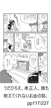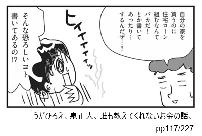 AccountThinking.net > D.文献等紹介 > 広告 D.文献等紹介お金の本 死ぬまでお金にこまらない! 2025年12月17日 この項目は広告を兼ねています。文献紹介(1) 書籍お金の本 死ぬまでお金にこまらない!は、実業家・論客ひろゆき(西村博之)による書籍です。にゃむーん「論破王」の異名を持つ、日本の論客にゃ。図書館で探す!Amazonで探す!楽天で買う! 引用部分を詳しく読もう!お金に対する無知詳しく読む!引用部分(お金に対する無知)の詳細を知りたい実業家・論客ひろゆきはその著書のなかでこのように述べます。罵詈雑言とすら思える言葉が並ぶ。それがひろゆきの弁論スタイル。ここでは、お金の無知を表現するため、あえてインパクトのあることばを集めて引用したぞ。わるたん消費者金融の利用者はバカ 引用元:ひろゆき、お金の本 死ぬまでお金に困らない!、pp410/1139/強調および改行は引用者による生命保険に入るのは頭が悪い 引用元:ひろゆき、お金の本 死ぬまでお金に困らない!、pp427/1139/強調および改行は引用者による「宝くじ」はバカが払う罰金 引用元:ひろゆき、お金の本 死ぬまでお金に困らない!、pp445/1139/強調および改行は引用者による 引用先の記事! お金の"無知"を直視しよう【やってみよう】このエピソードを引用している記事はこちら! にゃむーん「バカ」「頭が悪い」。腹が立ちますが、日本人のマネーリテラシーは総じてそういう評価ですにゃ。。。「自分の家を買うのに住宅ローン買うなんてバカだ!とか書いてあったり…するんだぜ…?」(ヒイイイイイイッ)「そんな恐ろしいコト書いてあるの!?」 ※画像をクリックすると引用コマの配置を確認できます。引用にあたっては細心の注意を払っておりますが、原作のご一読にご協力ください。詳しくはサイトポリシーをご確認ください。誰も教えてくれないお金の話イラストレーター・うだひろえによるコミックエッセイ「誰も教えてくれないお金の話」。 初学者による貴重な「学び」の記録です。さらに詳しく!この記事を書いた人kyo9557(ファイナンシャルプランナー/知的財産管理技能士)雇ってもらって働かないと生活が成り立たない、富裕層と労働者階級のグレーゾーンに位置する40代夫婦の片割れ。「労働者の常識」と「お金持ちの常識」とを併せ持つ強みを活かし、家計管理・投資・ライフプランニングの専門家として情報発信を行っています。運営者情報 / お問い合わせ -D.文献等紹介