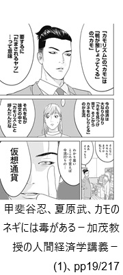 AccountThinking.net > D.文献等紹介 > 広告 D.文献等紹介カモのネギには毒がある-加茂教授の人間経済学講義- 2025年12月19日 この項目は広告を兼ねています。文献紹介(1) 漫画作品カモのネギには毒がある-加茂教授の人間経済学講義-は、甲斐谷忍、夏原武(原案)による連続ストーリー型の漫画作品です。にゃむーん天才で変人の加茂教授が、”わるもの”をぶった切ります。図書館で探す!Amazonで読む!楽天で買う! 引用部分を詳しく読もう!互助と取引ネタバレ注意!引用部分(互助と取引)の詳細を知りたいカモのネギには毒がある第1巻にあるエピソードからの引用です。図書館で探す!Amazonで読む!楽天で買う!ヒロイン美咲は、ひととき融資※の現場に、”生活苦の借金申込者”として潜入します。ヒロインは金主ザグレブに泣き落としを仕掛けるのですが・・・※画像をクリックすると引用コマの配置を確認できます。引用にあたっては細心の注意を払っておりますが、原作のご一読にご協力ください。詳しくはサイトポリシーをご確認ください。「お願いです 利子も払います ですのでどうか「ひととき」無しで融資お願いします」 ※画像をクリックすると引用コマの配置を確認できます。引用にあたっては細心の注意を払っておりますが、原作のご一読にご協力ください。詳しくはサイトポリシーをご確認ください。しかし、金主ザグレブは美咲を突き放します。「今のあんたに 体売る以外何の価値があるんだよ」 ※画像をクリックすると引用コマの配置を確認できます。引用にあたっては細心の注意を払っておりますが、原作のご一読にご協力ください。詳しくはサイトポリシーをご確認ください。にゃむーん分かりますでしょうか?美咲は互助を申し込み、ザグレブは取引を断っています。会話は成立しておらず、そして二人ともすれ違いに気付いていません※。※この記述は引用者独自の解釈によるもので、原作者の意向とは異なります。交換メーター※「肉体関係を持つことを条件にカネを貸す事」。/作中の表現をそのまま使用しています。 引用先の記事! 取引と互助の違いを学ぶ【家計を綺麗に☆お金の基礎知識】このエピソードを引用している記事はこちら! 作品を知ろう!「カモリズム」とは?詳しく知る!カモリズムは、消費者をだましてカネをむしりとることが主流になっていると警鐘を鳴らす、カモのネギには毒があるの作中概念です。「「カモリズム」の「カモ」は「鴨が葱しょってくる」の「カモ」 要するに「だまされるヤツ」・・・って意味」「今の経済は大なり小なり「カモを見つけ育て そこからカネをむしりとる」のが主流 それを私が論文の中で「カモリズム」と呼んだんだな」 ※画像をクリックすると引用コマの配置を確認できます。引用にあたっては細心の注意を払っておりますが、原作のご一読にご協力ください。詳しくはサイトポリシーをご確認ください。この記事を書いた人kyo9557(ファイナンシャルプランナー/知的財産管理技能士)雇ってもらって働かないと生活が成り立たない、富裕層と労働者階級のグレーゾーンに位置する40代夫婦の片割れ。「労働者の常識」と「お金持ちの常識」とを併せ持つ強みを活かし、家計管理・投資・ライフプランニングの専門家として情報発信を行っています。運営者情報 / お問い合わせ -D.文献等紹介