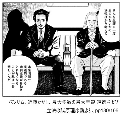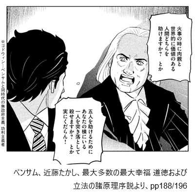 「トロッコ問題」に対し、マンガ「最大多数の最大幸福 道徳および立法の諸原理序説より」に登場するベンサムの亡霊は憤ります。