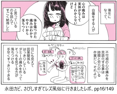 (後年になって、自傷をする人が)「心の痛みは実体がなくてよくわからないけど 体を傷つけた痛みはわかりやすいから落ち着く」(と言っているのを読んですごく納得した)