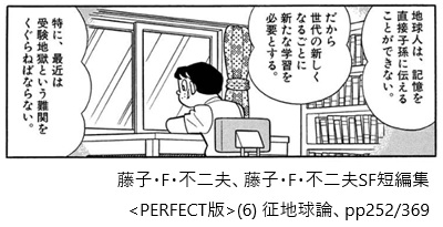 AccountThinking.net > D.文献等紹介 > 広告 D.文献等紹介征地球論/藤子・F・不二夫SF短編集より 2025年12月14日 この項目は広告を兼ねています。文献紹介(1) 短編漫画作品征地球論は、漫画家藤子・F・不二雄による短編漫画作品です。にゃむーん思想家としての藤子・F・不二雄を知ることができますにゃ。トビラ絵Amazonで読む!楽天で買う!藤子・F・不二夫SF短編集<PERFECT版>漫画家藤子・F・不二夫による単話完結型のSF短編集。 巨匠の思想家・哲人としての顔を垣間見ることができます。本作品はこちらに掲載! 引用部分を詳しく読もう!コミュニケーションの限界・アロセントリック解釈詳しく読む!引用部分(アロセントリック解釈)の詳細を知りたい宇宙人たちが地球への侵攻・征服を目論みます。にゃむーん宇宙人視点から自分たちを見るアロセントリック解釈は、藤子・F・不二夫の得意技ですにゃ。巨匠は宇宙人たちの口を借り、人類のコミュニケーション能力の限界をこのように表現します。「地球人は、記憶を直接子孫に伝えることができない。だから世代の新しくなるごとに新たな学習を必要とする。特に、最近は受験地獄という難関をくぐらねばならない。」 ※画像をクリックすると引用コマの配置を確認できます。引用にあたっては細心の注意を払っておりますが、原作のご一読にご協力ください。詳しくはサイトポリシーをご確認ください。 引用先の記事! ロゴス記法🄬とは?【ことばの解説】このエピソードを引用している記事はこちら! 引用先の記事! アロセントリック解釈このエピソードを引用している記事はこちら! ロゴス記法🄬詳しく読む!引用部分(ロゴス記法🄬)の詳細を知りたい宇宙人たちが地球への侵攻・征服を目論みます。彼らは議論の簡略化のため「思考交換」を行います。「全員の思考交換を行って 似たりよったりの意見は、一人に代表させる。必要最低限の人員までしぼりこむのだ。」「それでいいんでないの。」「いいかげんうんざりしてたところだ。」「思考交換をやろう。」※画像をクリックすると引用コマの配置を確認できます。引用にあたっては細心の注意を払っておりますが、原作のご一読にご協力ください。詳しくはサイトポリシーをご確認ください。手っ取り早くていいな。わるたん人類もこんなふうに、世代を超えて思考交換ができればよいのですが…。 引用先の記事! ロゴス記法🄬とは?【ことばの解説】このエピソードを引用している記事はこちら! 作品を知ろう!思想家 藤子・F・不二夫詳しく知る!漫画家藤子・F・不二雄は思想家でもあります。藤子・F・不二夫SF短編集に掲載される作品には、みな深い思想・哲学が込められています。にゃむーん運営者の一方は、これを小学生の時に読み、トラウマになりました。それくらい、深い深~い作品群にゃ。この記事を書いた人kyo9557(ファイナンシャルプランナー/知的財産管理技能士)雇ってもらって働かないと生活が成り立たない、富裕層と労働者階級のグレーゾーンに位置する40代夫婦の片割れ。「労働者の常識」と「お金持ちの常識」とを併せ持つ強みを活かし、家計管理・投資・ライフプランニングの専門家として情報発信を行っています。運営者情報 / お問い合わせ -D.文献等紹介