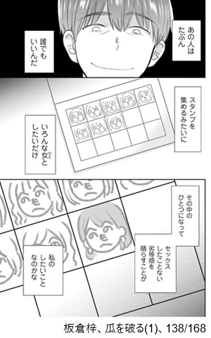 AccountThinking.net > D.文献等紹介 > 広告 D.文献等紹介瓜を破る 2025年12月17日 この項目は広告を兼ねています。文献紹介(1) 漫画作品瓜を破るは、漫画家板倉梓による連続ストーリー型(2025年現在、既刊12巻連載中)の漫画作品です。にゃむーんキャッチフレーズは「誰もが心当たりがありそうな、言葉にならない思いをあぶりだす現代の冒険譚」。そのテーマは、ミドルエイジ女性の恋と性。一部性的描写があります。苦手な方はご注意ください。図書館で探す!Amazonで読む!楽天で買う! 引用部分を詳しく読もう!体験分析法&純粋直観&イデア法詳しく読む!引用部分(イデア法)を詳しく知りたい主人公まい子は、30歳を超えても性体験がないことをコンプレックスに思います。彼女は思い切って行動を起こすのですが、出会ったのは ”なんだかなぁ" なナンパ師。(それなのに私 のこのこついてきちゃて こんな私だからイケるって思ったんだろうなこの人も) ※画像をクリックすると引用コマの配置を確認できます。引用にあたっては細心の注意を払っておりますが、原作のご一読にご協力ください。詳しくはサイトポリシーをご確認ください。焦りゆえ、無理にナンパ師に身を任せようとするも…(あの人はたぶん誰でもいいんだ)(スタンプをアルメルみたいに いろんな女としたいだけ)(その中のひとつになって セックスしたことない劣等感を晴らすことが 私のしたいことなのかな) ※画像をクリックすると引用コマの配置を確認できます。引用にあたっては細心の注意を払っておりますが、原作のご一読にご協力ください。詳しくはサイトポリシーをご確認ください。(違う) ※画像をクリックすると引用コマの配置を確認できます。引用にあたっては細心の注意を払っておりますが、原作のご一読にご協力ください。詳しくはサイトポリシーをご確認ください。まあ違うよな。明らかに。わるたん合っているのか、違うのか。それは体験を通した純粋直観でわかるのです!どらん先生(-私は あったかい愛のあるセックス がしたい)(それがどういうものか 今はまだ 全然わからないけど)「う゛え゛え゛え゛っ…」 ※画像をクリックすると引用コマの配置を確認できます。引用にあたっては細心の注意を払っておりますが、原作のご一読にご協力ください。詳しくはサイトポリシーをご確認ください。にゃむーんどこが、どのように違うかはわからない。目指すものも全然わからない。でも、違うことはなぜか分かる。哲学者ヒュームは懐疑論を立て、全てを疑いました。しかし、経験で分かることは疑いませんでした。どらん先生「実際 絶望的な結論を出した哲学者もいる」(私はどこまでも疑い続ける 直に経験したことだけが真実 確かなものは何もない この世に決まっていることなど何ひとつない)(デイヴィッド・ヒューム) ※引用にあたっては細心の注意を払っておりますが、原作のご一読にご協力ください。詳しくはサイトポリシーをご確認ください。現象学の理念フッサールによる「現象学の理念」のコミカライズ解説書。 その難解さが緩和され、かなり分かりやすくなっています。さらに詳しく!わからないけど、わかる。認識論的には、これは途方もない事実なのです!どらん先生純粋直観とは?【ことばの解説】「純粋直観(intuition)」は、明確な理由も根拠もないけれども、「なんとなくわかる」という現象です。さらに詳しく!図書館で探す!Amazonで読む!楽天で買う!天秤にかける詳しく読む!引用部分(天秤にかける)を詳しく知りたい40代独身のデキる女・鐘子(しょうこ)は自宅でひとりつぶやきます。(正直生理的には全然アリだし 私にだって性欲もあって さみしい夜もありますよ) ※画像をクリックすると引用コマの配置を確認できます。引用にあたっては細心の注意を払っておりますが、原作のご一読にご協力ください。詳しくはサイトポリシーをご確認ください。(さみしい夜と そのめんどくささを天秤にかけた時に)(今の私はもう めんどくささが断然勝つ) ※画像をクリックすると引用コマの配置を確認できます。引用にあたっては細心の注意を払っておりますが、原作のご一読にご協力ください。詳しくはサイトポリシーをご確認ください。鐘子には、かつて恋人がいました。しかし、やや面倒な人物だったことが災いし、トラウマになってしまったのです。(よしよし しなきゃだめ?~~結婚したらこの先この散らかった部屋でずーーーっとこれが続くの??)(………無理 無理~~~~~~~~~~~~っ) ※画像をクリックすると引用コマの配置を確認できます。引用にあたっては細心の注意を払っておりますが、原作のご一読にご協力ください。詳しくはサイトポリシーをご確認ください。厳しいかもしれんが、トラウマ克服は自己責任だ。人生の責任は誰も取ってはくれんのだ。悔いのないようにな…。わるたん図書館で探す!Amazonで読む!楽天で買う!過去に意味を見出すというのは、単に「あれでよかったんだよ」と言ってただ過去を肯定することではない